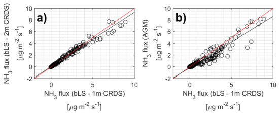 Correlation between the NH3 fluxes estimated by (a) CRDS-bLS 1 m and CRDS-bLS 2 m and (b) CRDS-bLS 1 m and AGM in the May campaign. The black lines are Deming regression lines, and the red lines are 1:1 lines. The regression coefficients are shown in Table 4.