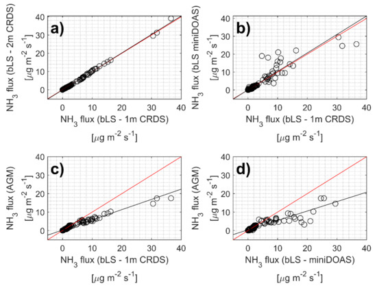 Correlation between the NH3 fluxes estimated by (a) CRDS-bLS 1 m and CRDS-bLS 2 m, (b) CRDS-bLS 1 m and miniDOAS-bLS, (c) CRDS-bLS 1 m and AGM, and (d) miniDOAS-bLS and AGM in the August campaign. The black lines are Deming regression lines, and the red lines are 1:1 lines. The regression coefficients are shown in Table 4.