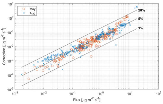 The size of the correction of the AGM flux exhibited a linear relationship in a log–log plot, as seen in Figure 8. The flux magnitude generally increased with the increasing wind speed, which, on the other hand, increased the footprint area. The atmospheric stability also influenced the footprint area, and a larger footprint area corresponding to a smaller fraction of the source inside the total footprint area caused a larger correction.