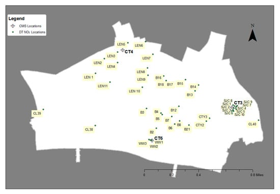 In 2017, the CoL undertook continuous monitoring of NO2 at three CMS locations [] identified in Figure 2 with the code CT:
