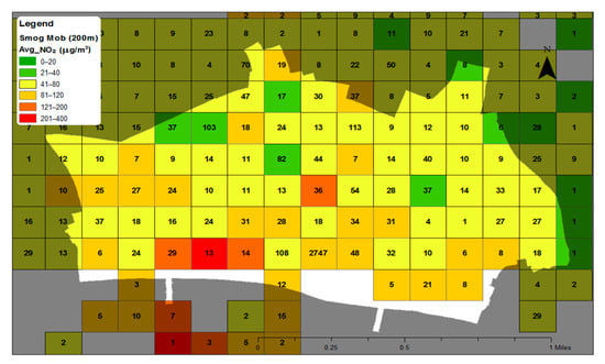 Both Figure 3 and Figure 4 indicate that only an area covering approximately six 200 m × 200 m grid squares (or twenty-four 100 m × 100 m grid squares) within the City boundary experienced average NO2 concentrations of less than or equal to 40 µg/m3. This is equivalent to an area of approximately 0.24 km2, 7.62% of the entire area within the CoL boundary (3.15 km2).