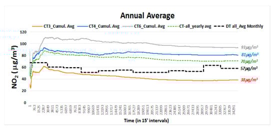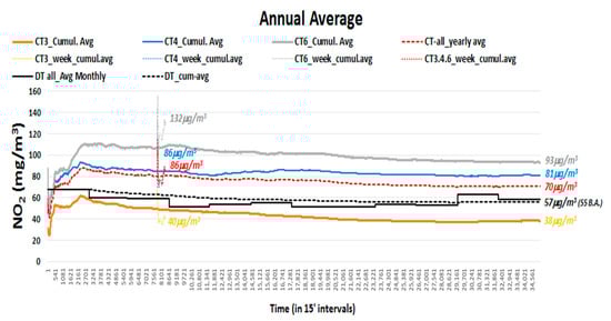Another interesting finding is that when comparing the full weekly average NO2 concentration (Figure 7) with the annual mean for the individual and combined CMS, the values are very close (within 10%) except for CT6 where higher concentrations (116 µg/m3) were measured. This provides evidence that precision measurements, although made in a limited time period (one week), can be used as a good proxy of the annual average. This is envisaged to have the potential for two main innovative applications: