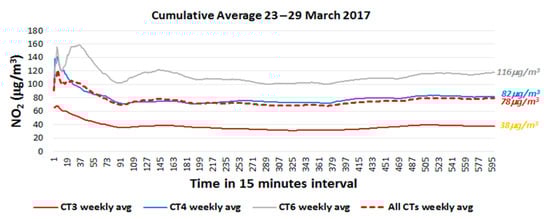 Figure 7 shows the cumulative average for each of the three CMS (and the average of all three CMS) during the entire Smogmobile Survey period (from 7:30 a.m. on the 23 March 2017 until 13:00 on the 29 March 2017). Average values for CT3, CT4, CT6, and all CTs are 38 µg/m3, 82 µg/m3, 116 µg/m3 and 78 µg/m3, respectively, consistently higher than those in Figure 9, between 5% and 12%.