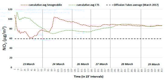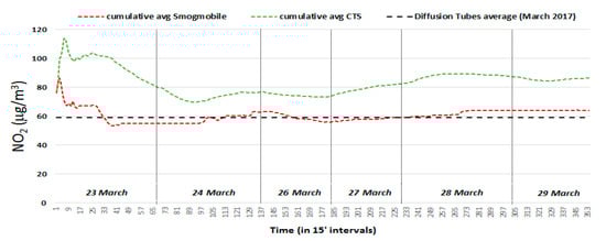 In Figure 8, the cumulative average CMS and Smogmobile concentrations tend to stabilise and converge, at the beginning of 28 March 2017, close to a value of approximately 86 µg/m3. This initial result indicates that the Smogmobile is capable of representing the average concentration across the City area, assuming that the CMS are considered to be broadly representative of air quality levels across the City.