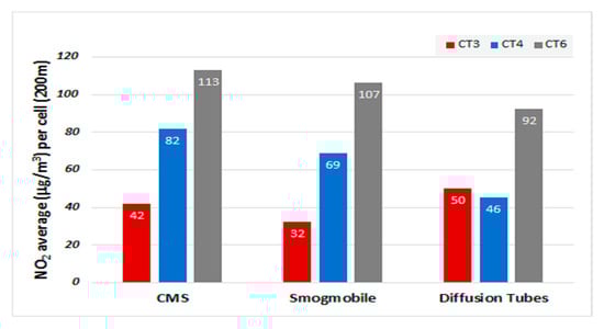 Based on the density plot analysis presented in Section 3.1 and considering the 200 m cell/grid network identified, by taking the three cells where the CMS are located and using the same ID reference to obtain the average NO2 concentration of the Smogmobile data points and diffusion tubes falling within those cells, a comparative analysis between Smogmobile, CMS, and diffusion tube average concentrations was carried out (see Figure 10).