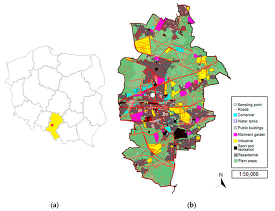 The location of the sampling point (50.3° N, 18.7° E) shown on the map of Poland with the Silesian voivodeship marked (a) and with an indication of the specified land development in Zabrze (b). (The land development map was made using the generally available QGIS 3.6.3 software).