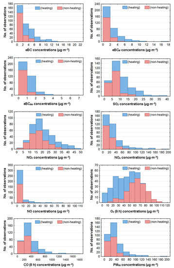 The next step in the verification of the results was the assessment of the normality of the distribution of the 24-h data sets. It was related to the possibility of using the parametric Student’s t-test, which is much more powerful compared to typical non-parametric tests such as the U-Mann Whitney test [62,63,64]. First, the frequency distributions of the daily averaged mass concentrations of the analyzed pollutants were prepared, both for the data from the entire measurement period as well as by the heating and non-heating season (Figure 2). The dataset distribution was evaluated using the Kolmogorov-Smirnov test (α = 0.05)—among the tested pollutants, only O3 daily mass concentrations showed a normal distribution. The remaining data were log-transformed. Subsequently, the seasonal variability of the mass concentrations of the measured substances was analyzed (Student’s t-test, α = 0.05). The interrelationships between eBC concentration and meteorological parameters as well as the mass concentration of selected gaseous pollutants measured at the sampling site were examined by Pearson correlation analysis (α = 0.05), separately for the data set from the heating and non-heating season. All statistical analyses were performed using the Stat Soft software package Statistica 12.0.