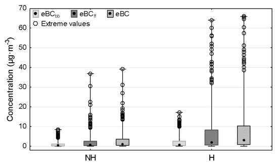 Box and Whisker plots for hourly averaged concentrations of eBC, eBCff, and eBCbb, separately for the non-heating (NH) and heating (H) season. (The dot represents the median value; the box is marked by the 10th and 90th percentiles, and the whiskers—by the minimum and maximum values).
