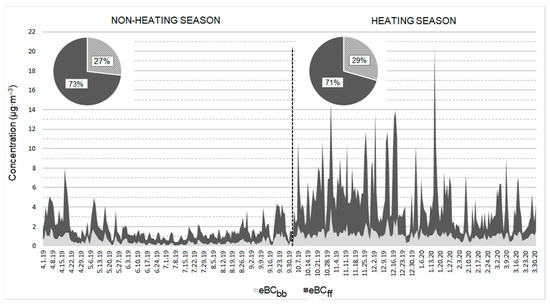 The daily BCff and BCbb concentration courses (µg·m−3) and their average share in the total BC (%) recorded for the heating and non-heating season.