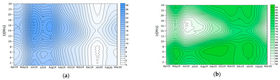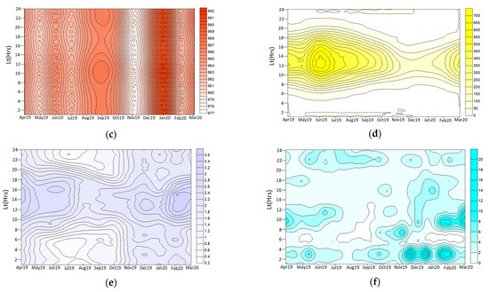 The monthly course of selected meteorological parameters: air temperature (°C) (a), relative humidity (%) (b), pressure (hPa) (c), solar radiation (W/m2) (d), wind speed (m·s−1) (e) and precipitation (l/m2) (f). (Monthly-hourly variations of surface of meteorological parameters were made using the SURFER 8 software).