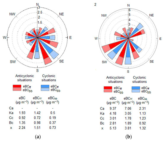 The analysis of the influence of atmospheric circulation types and the type of air masses on the distribution of eBC, eBCff, and eBCbb concentrations (Figure 7) showed seasonal differences in terms of the dominant sectors. In both measurement seasons, differences were observed in the distribution of eBC, eBCff, and eBCbb concentrations for individual types of circulation. Moreover, the distributions of the components eBCff and eBCbb for individual types of circulation were analogous to the distribution of eBC. In the non-heating season (Figure 7a), both anticyclonal and cyclonal circulations played an important role in shaping the level of eBC, eBCff, and eBCbb. During anticyclonal circulations, the greatest importance in shaping elevated levels of BC (>2 µg·m−3), eBCff (>1 µg µg·m−3) and eBCbb (>0.5 µg·m−3) was the inflow of air masses from the eastern sector (Ea), Northeast (NEa), and South (Sa). In the case of cyclones, these were inflows from the south-eastern (SEc), southern (Sc), and eastern (Ec) sectors and unclassified situations (x).