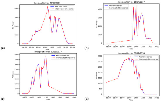 Original and interpolated PV power output time-series for the dates (a) 27 March 2017, (b) 15 April 2017, (c) 29 November 2017, and (d) 12 January 2018, for which missing values existed.