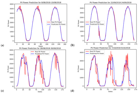 Moreover, it can be observed from Figure 5c,d that during days with a lot of sharp fluctuations in the actual PV power output, the predicted PV power output is not far off. Most importantly, the predicted power output signal seems to react to each fluctuation and to follow its trend, thus capturing the overall behaviour of the real power output time series.