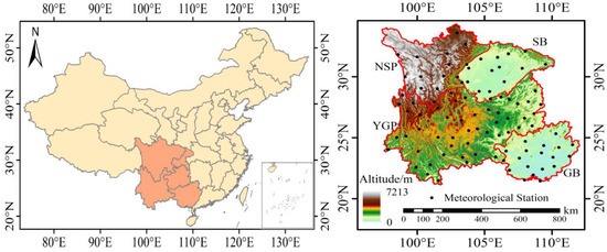 The southwest region of China mainly includes the Northwest Sichuan Plateau (NSP), the Sichuan Basin (SB), the Guangxi Basin (GB) and the Yunnan–Guizhou Plateau (YGP). The SB is one of the main grain-producing areas in the country, with an area of about 260,000 km2 and a population of 90 million. The famous Dujiangyan project located in the middle of the SB, with an irrigation area of about 67,000 km2. The NSP is one of the five largest pastoral areas in China and the largest animal husbandry base in Sichuan, covering an area of approximately 166,000 km2. The terrain of the GB is higher in the northwest and lower in the southeast, and the elevation is generally 80 to 200 m, mostly limestone, covering an area of about 70%, with obvious karst landforms. The YGP located in southwestern China and is one of the four major plateaus with a total area of about 500,000 km2. This specific distribution is shown in Figure 1.