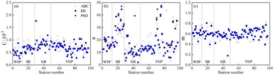 (a–c) Calibration results of HG model empirical parameter (C, a, m) based on the ABC, DE and PSO optimization methods. Note, NSP: Northwest Sichuan Plateau; SB: Guangxi Basin; GB: Sichuan Basin; YGP: Yunnan–Guizhou Plateau.