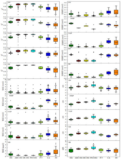 - On a monthly scale, the calibrated HG model (RE < 18%) showed a better performance than the 4 physical models (RE > 18%) at the 4 sub-zones. PSO-HG model showed the best performance for ET0-mad estimation in NSP, YGB, SB and GB, with average RE of 3.48%, −1.64%, 6.10% and −0.92%. In SW research region, the PSO-HG model showed the best performance for ET0-mad estimation, followed by ABC-HG and DE-HG model, with R2 median of 0.96, 0.95 and 0.94, RRMSE median of 0.16 mm/m, 0.17 mm/m and 0.18 mm/m, MAE median of 0.46 mm/m, 0.50 mm/m and 0.55 mm/m, and GPI median of 1.13, 0.47 and 0.35, respectively.