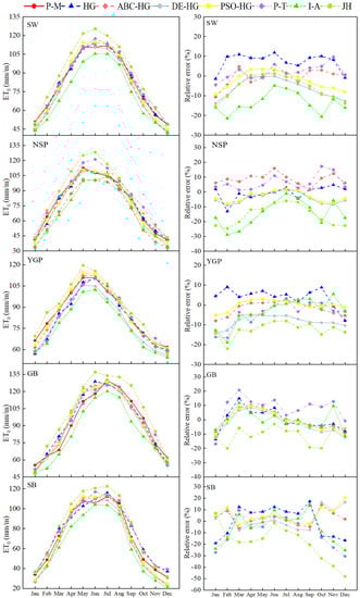 Based on ABC, DE and PSO optimization algorithms, the monthly average ET0 estimated in Southwest China and the four regions are properly explained in Figure 5 and the monthly average ET0 estimated by different models showed a parabolic change. For SW, NSP, SB, GB and YGP, the error range of HG model calibrated by optimization algorithm a were 15.40 to 3.40%, −28.17 to 2.10%, −14.32 to 3.01%, −33.75 to 5.42% and −12.41 to 10.76%. Also, the error ranges of 4 empirical models were −21.51 to 11.81%, −51.95 to 17.33%, −22.04 to 9.07%, −48.09 to 20.68% and −20.09 to 20.70%. These results showed that the accuracy of the HG model improved by the optimization algorithm in estimating monthly scale ET0 and it was obviously better than that of the commonly used empirical model. In addition, the accuracy of the estimated monthly ET0 of the seven models during the period from May to September was relatively high and the relative errors in SW, NSP, SB, GB and YGP were lower than 11.80%, 11.01%, 7.05%, 4.92% and 5.06%, respectively, which may be due to the complex topographic structure of the southwest region and the small difference in surface temperature. The 4 empirical models had higher accuracy in summer and lower accuracy in winter, because the terrain structure there is complex, and winter is mostly cloudy and rainy. On the YGP, the terrain structure is mostly karst landforms, caused by the different degrees of soil evaporation, which leads to differences in relative humidity. Overall, the PSO-HG model had the highest accuracy of ET0 estimated by SW, NSP, YGB, SB and GB, with average relative errors of −2.69%, 3.48%, −1.64%, 6.10% and −0.92%. Therefore, the PSO-HG model might be the best fit to estimate monthly scale ET0 in Southwest China.