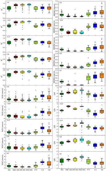 where R2 and NS are the main indicators with equal to −1. For other indicators, is equal to 1, yj is the median value of the scale value of index j, yij stands for the scale value of index j of model i. The GPI value gets higher according to the accuracy of the model.