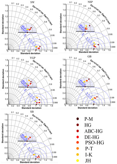 Figure 6 is based on the HG model calibrated by ABC, DE and PSO algorithms and 4 empirical models, which showed the monthly ET0 accuracy index estimated in the SW, NSP, YGP, GB and SB. On the monthly scale, the median line range of R2, RRMSE and MAE of the ET0-ABC-GH value in different regions of Southwest China were 0.91–0.96 (average value 0.93), 0.06–0.13 mm/m (average value 0.08) and 0.43–0.98 mm/m (average value 0.65), respectively. Adding to that, the median lines of ET0-DE-GH value were 0.94–0.96 mm/m (average value 0.95), 0.06–0.12 mm/m (average value 0.08) and 0.42–0.67 mm/m (average value 0.51) and the median lines of ET0-PSO-GH value hit 0.95–0.97 (average value 0.96), 0.05–0.10 mm/m (average value 0.08), and 0.34–0.75 mm/m (average value 0.48). When it comes to the accuracy of the 4 empirical models in each region in the southwest region, the median lines of R2, RRMSE and MAE were 0.75–0.86 (average value 0.80), 0.21–0.72 mm/m (average value 0.43 mm/m) and 0.76–2.25 mm/m (average value 1.12 mm/m). According to the GPI estimated by all models, the PSO-HG model was the most assertive one, followed by the ABC-HG and DE-HG models, with median lines that marked 1.13, 0.47 and 0.35, respectively. However, the JH model showed lower accuracy, followed by IA, P-T and HG model, with median lines as −0.82, −0.64, −0.04 and 0.02, respectively. Hence, in the southwest region, the accuracy of the optimized HG model is higher than that of the empirical model, and the accuracy of the PSO-HG model surpasses the other models. Figure 7 shows Taylor diagrams that represent the relationship among the standard deviation, root mean square error, and determination coefficient of each model, and intuitively shows the estimated monthly ET0 accuracy of the 7 models at each weather station site. This also shows that the monthly ET0 estimated by the PSO-HG model is the most precise one.