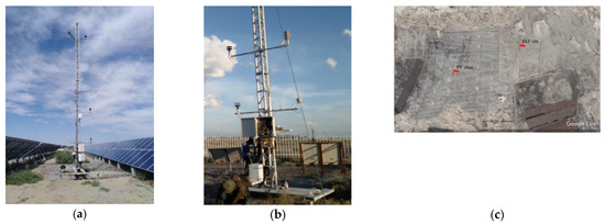 We set up two observation systems in and out of the plant, respectively. One (Figure 1c) was located out of the plant and taken as the reference site as it was free of PV panels, compared to the one inside the plant (Figure 1a). The location of the observation site in the PV plant is 44.406° N, 87.656° E with the altitude of 439 m. The reference site is located 910 m northeast to the observation point in the plant (44.409° N, 87.667° E) with the altitude of 437 m. The terrain is relatively flat. The observation systems contained two meteorological observation towers of 11 m high, respectively. The underlying surface is Gobi with sparse vegetation. The soil type is sandy soil, and the soil texture is relatively coarse.