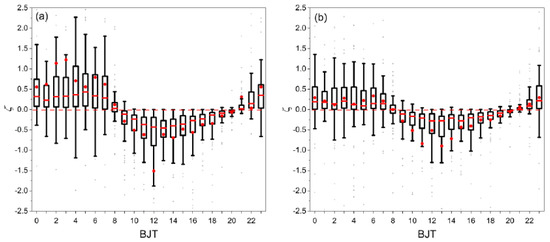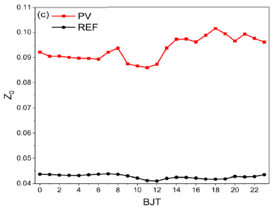 Atmospheric stability and aerodynamic roughness are important factors that control the energy exchange between the Earth and atmosphere. The diurnal variation of was analyzed for the PV plant and the reference site in Figure 2. The positive during early morning and at night indicated stable conditions () of near-surface atmosphere due to the stratification of the atmosphere caused by surface radiational cooling, while the negative during the daytime from 9:00 to 17:00 indicated unstable conditions (), which resulted from the accumulation of surface solar radiation. Although similar characteristics of were found at both sites, there were a few differences. During the daytime, the near surface air has higher instability with the average minimum of smaller than −1.5 at 12:00 in the PV plant compared with the reference site (Figure 2a,b). The highly unstable conditions of near surface air may be caused by the strong convection exchange in the PV plant reported in the previous study [35]. For nocturnal hours, larger in the PV plant indicated more stable near surface atmospheric stratification than that of the reference site, which may have resulted from the thermal insulation effect of PV modules on the ground surface at night. The magnitude of daily variation of in the PV plant was larger than that of the reference site, as evident from the length of the whiskers.