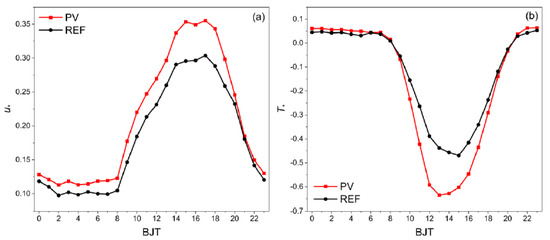 Diurnal variation of the scaling parameter of velocity (a) and temperature (b) in the PV plant (red line) and the reference site (black line), BJT is to Beijing time.