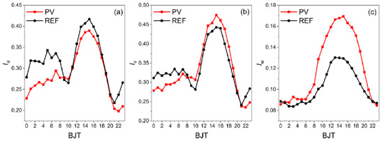 The average daily variation of turbulence strength component of longitudinal wind (a), lateral wind (b), and vertical wind (c) in the PV plant (red line) and the reference site (black line), BJT is to Beijing time.