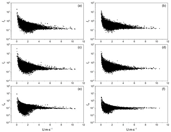Relationship between the turbulence strength and wind speed at the PV plant (left: (a,c,e) and the reference site (right: (b,d,f), U is the horizonal wind speed.