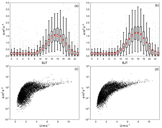 Diurnal variation of turbulent kinetic energy e in the PV plant (a) and the reference site (b). The height of the box shows the range from the 25th to 75th percentile. The horizontal red line inside the box and solid red dot denote the median value and mean value, respectively. The ends of the whiskers are drawn to the 10th and 90th percentile values. The relationship between turbulent kinetic energy and wind speed for the PV plant (c) and the reference site (d), U is the horizonal wind speed.