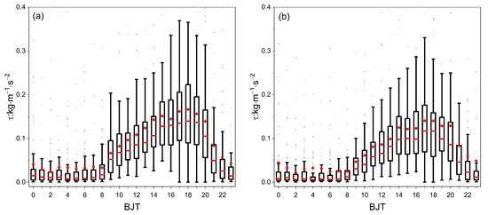 Diurnal variation of momentum flux in the PV plant (a) and the reference site (b). The height of the box shows the range from the 25th to 75th percentile. The horizontal red line inside the box and the solid red dot denote the median value and mean value, respectively. The ends of the whiskers were drawn to the 10th and 90th percentile values.