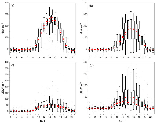 Diurnal variation of sensible heat flux (H:) in the PV plant (a) and the reference site (b) and the latent heat flux (LE:) in the PV plant (c) and the reference site (d). The height of the box shows the range from the 25th to 75th percentile. The horizontal red line inside the box and solid red dot denote the median value and mean value, respectively. The ends of the whiskers were drawn to the 10th and 90th percentile values.