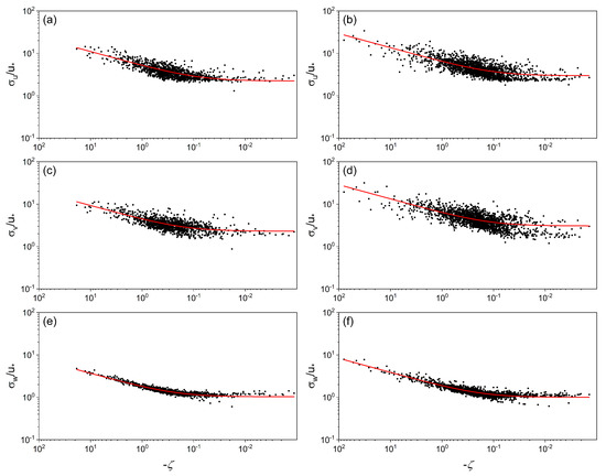 Normalized standard deviation of longitudinal wind velocity (), lateral wind velocity (), and vertical wind velocity for unstable stratification conditions at the PV plant (left: (a,c,e) and the reference site (right: (b,d,f) from June to October 2019. The red solid line represents the empirical relations applied to the observed data.