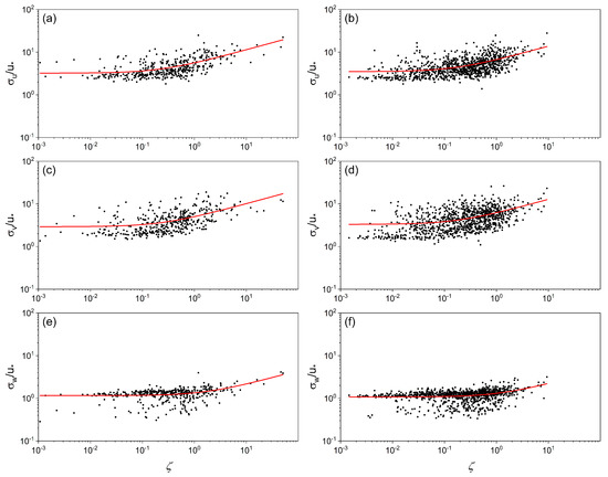 Normalized standard deviation of longitudinal wind velocity (), lateral wind velocity (), and vertical wind velocity for stable stratification conditions at the PV plant (left: (a,c,e) and the reference site (right: (b,d,f) from June to October 2019. The red solid line represents the empirical relations applied to the observed data.