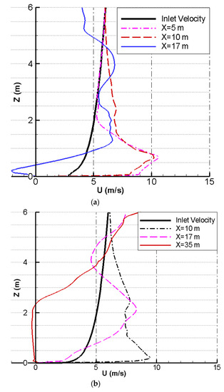 Vertical profiles of longitudinal velocity at different longitudinal positions (Uref = 6 m/s, t = 20 s) aligned with the (a) midplane Y = 0 (b) section plane at Y = 9 m.