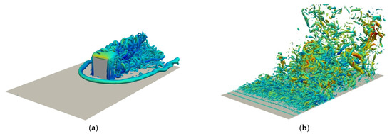 In order to visualize the three-dimensional flow features inside the domain, the Q-criterion [64] is employed. Figure 5 illustrates the vortical structures generated in the presence and absence of fire using Q-Criterion isocontours coloured by the spanwise velocity magnitude in the z-direction to better illustrate buoyancy effects. In the absence of fire, a horse-shoe vortex is formed upstream of the building. This is a common phenomenon as a bluff-body encounters a turbulent boundary layer. Other toroidal and hair-pin vortex cores shedding from the sides of the building are relatively small and are mostly aligned with the streamwise direction. However, as can be seen in Figure 5b, the flow pattern substantially changes in the presence of the fire. In the attachment region, the breakdown of the turbulent boundary layer into small streamwise vortices is highly controlled by the high-momentum flow near the surface. Similar patterns have been reported in experimental observations of laboratory-scale fires, for example [65]. Moving further downstream, as the buoyancy-induced forces become dominant, the flow structures are transformed into larger crosswise vortices creating uplift.