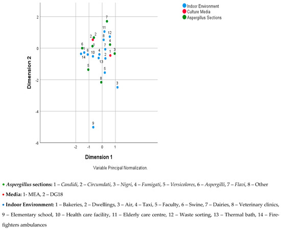 The multiple correspondences analysis was carried out in two parts, as there was a strong relationship between the sampling approach and the indoor environment, and the interpretation was more challenging to achieve. Figure 1 shows the relationship between Aspergillus sections, culture media, and indoor environment, where it can be seen that: (i) Candidi is associated to the DG18 and the indoor environments swine, healthcare facility, and taxi; (ii) Circumdati is associated to the DG18; (iii) Nigri is associated to the MEA and to the indoor environment dwellings and dairies; (iv) Fumigati is associated to the MEA and to the indoor environments waste-sorting plants, veterinary clinics, and dairies; (v) Aspergilli is associated to the indoor environment firefighters’ ambulances, bakeries, and swine and to the DG18; (vi) Flavi is associated to the indoor environment elderly care center and waste-sorting plant; (vii) others (Terrei, Nidulantes, Clavati, Usti, Cremei, and Restricti) are associated to the indoor environment college.