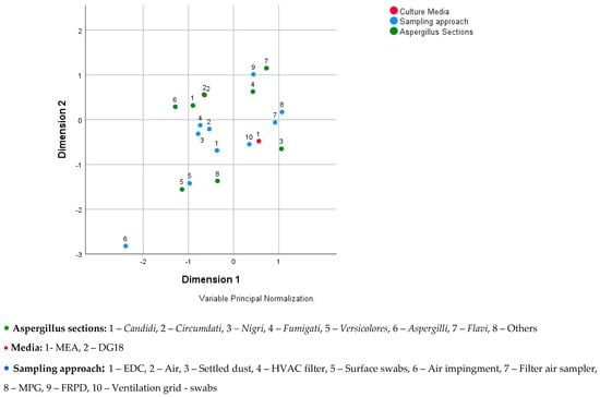 Figure 2 shows the relationship between Aspergillus sections, media, and sampling approach, where the following can be seen: (i) Candidi, Circumdati, and Aspergilli are associated to the DG18 media; (ii) Fumigati and Flavi are associated to the sampling approach FRPD; (iii) Nigri is associated to the MEA and to the sampling approach ventilation grid—swabs and filter air sampler; (iv) others (Terrei, Nidulantes, Clavati, Usti, Cremei, and Restricti) are associated to the sampling approach EDC and surface swabs; and (v) Versicolores is associated to the sampling approach surface swab.