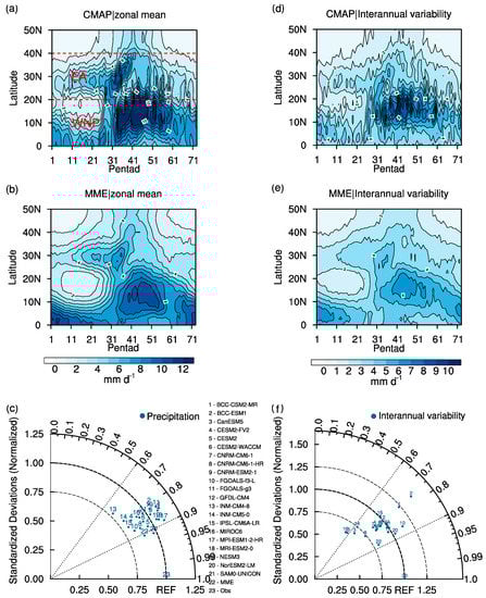 We first evaluate the large-scale spatiotemporal fidelity of the climatological rainband in the EA-WNP sector. Figure 1a displays the seasonal migration of the CMAP rainfall in EA and WNP. In general, the MME could reproduce the observed rainy season (Figure 1b). The simulated seasonal cycle of the tropical precipitation over 0–20° N varies consistently with the seasonality of the intertropical convergence zone (ITCZ) over WNP as the observation. In extratropic, the CMIP6 models can capture the observed northward migration of the subtropical monsoon precipitation, including the spring rainy season starting in south China, followed by two rainy periods (i.e., Meiyu/Baiu system and fall rainy season). The simulated seasonal evolution of the rainband by CMIP6 improves slightly than the CMIP3 and CMIP5 models [,,]. However, some details vanish in the ensemble mean of the model simulations. For instance, high-frequency variations and some dry breaks in observation cannot be well reproduced. The precipitation amount is significantly weaker than the observation. It is one of the longstanding systematic biases in the current climate models. For the individual models, except for INM-CM4-8, others show high pattern correlation coefficients (PCCs) between 0.8 and 0.9 comparing with the observation (Figure 1c). The PCC of the ensemble result reaches 0.908 and is comparable to the best models, such as the NorESM2-LM (PCC = 0.914). The standardized deviation ratios (SDR) ranging from 0.75 to 1.2 indicate that the uniform spatial distribution is good in some models but bad in others.