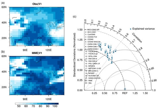 The proportion of total variance explained by the annual cycle component of rainfall over East Asia (EA) (unit: %). (a) CMAP, (b) MME. (c) Taylor diagram for the explained variances.