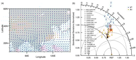 Simulation on the spatial distribution of the gridded and of the annual cycle components over EA. (a) vector map for the annual cycle 73-pentad clock in observation (OBS) and MME. The length of the arrow quantifies the . The clockwise rotated vector with the northward vector indicates the at Julian pentad 1 and a total 73 pentads evenly distributed within 360°. The red, blue, purple, and green arrows represent the in spring, summer, autumn, and winter. The opaque and translucent arrows indicate the simulations and observations, respectively. (b) Multivariable Taylor diagram of the and of the annual cycle component. The star and diamond markers represent the GME and PME, as discussed later in Section 4.