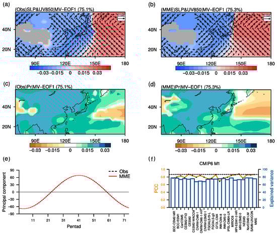 First annual cycle mode (M1) of EA precipitation from MV-EOF1 in (a,c) OBS and (b,d) MME. (a,b) show the spatial structures for the SLP and 850-hPa horizontal wind anomalies and (c,d) for precipitation anomalies. The explained variance of M1 is 75.1% in observation and 75.3% in MME simulation. (e) Principal component (PC) time series of MV-EOF1. The horizontal axis ranges from Julian pentad 1 to 73. The black trigonometric function curve indicates the observation, and the red one indicates the MME mean. The amplitude and phase of the PC1 series are adopted as the amplitude () and phase () of M1. (f) Explained variances (blue bar) of MV-EOF1 in individual models and the MME mean. The MV-EOF is applied on the MME and individual models, respectively. The orange curve indicates the multivariate pattern correlation coefficients between the MV-EOF1 spatial pattern in OBS (a,c) and models (such as (b,d) for MME). The black dashed line indicates the MME PCC.