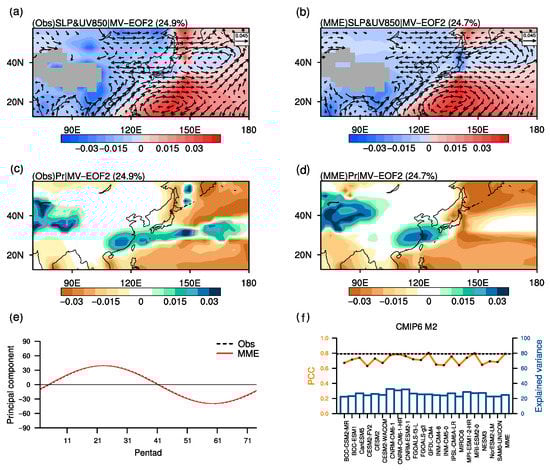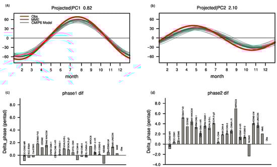 Since the M1 and M2 are stable among individual CMIP6 models, resemble the observation, and not sensitive to the temporal variation, we can project the simulated results onto the observed modes to reconstruct the PCs (i.e., projected PC1 and PC2) and make a unified comparison. This is a commonly used strategy under the precondition of finding a stable projection basis (e.g., the MJO [,]). The amplitudes of the projected PC1 (abbreviated to ) share significant common biases across the models, consistent with the systematic bias in the monsoon intensity (Figure 1b). All the simulations are weaker than the observations, though the MME result performs better (Figure 7a). The projected phase in simulation () is either slightly lead or lag the observations (Figure 7c). Most models can reproduce the timing of the mature phase with the biases less than 1.5 pentads, except for the CESM2-FV2 (1.81 pentads phase delay) and CESM2-WACCM (1.58 pentads phase delay). Some models (CNRM-CM6-1, CNRM-CM6-1-HR, CNRM-ESM2-1, INM-CM5-0, and MRI-ESM2-0) can accurately simulate the , which is beyond the MME simulation (0.27 pentads phase delay). The inter-model standard deviation of biases is 0.82 pentads.