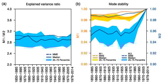 Mode stability during different modelled climatology among all the models. (a) Ratios of the explained variance of M1 to M2 in individual models and the MME mean. The horizontal axis represents 14 sliding modelled climatology covering the period from 1850 to 2014. (b) The PCCs between the MV-EOF pattern for 1979–2014 climatology and the pattern during different climatology. The dash curves in (a) and (b) refers to the MME results. The solid curves and blue shadings indicate the median and the 25- to 75-percentiles of the 21 models.