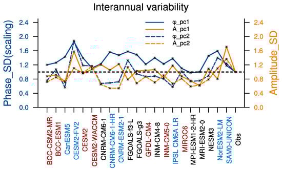 More challenging in climate models, the annual cycle varies substantially year by year and exhibits prominent interannual variations. In the following, we project the annual cycle component of every year onto the observed M1 and M2. Every single year has its projected amplitude () and phase () of the annual cycle modes. Hence, we obtain the interannual standard deviations (ISDs) of the and in individual models, as shown in Figure 8. In general, the simulated interannual variations of the amplitude are relatively weak compared to the observation, as the scaled ISDs below the reference line, especially the amplitude of M2. On the other hand, the simulations of the phase ISD are mostly higher than the observations. Nearly all the models overestimate the phase ISD of M1, and half models overestimate the phase ISD of M2. Some reproduce all four ISDs relatively well. Examples are the BCC-ESM1, GFDL-CM4, BCC-CSM2-MR, and INM-CM5-0, which also considerably capture the climatological annual cycle mode (Figure 7). In contrast, models with the low accuracy of the climatology (e.g., CESM2-FV2, CNRM-ESM2-1, and NorESM2-LM) tend to exhibit notable biases in ISD.