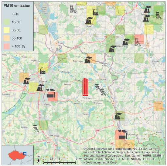 The studied area—Ostravsko-karvinská agglomeration—is situated in the northeast part of the Czech Republic, in the Moravian-Silesian Region. The region, together with the adjacent cross-border Polish region of Silesia, is historically connected with the accumulation of black coal mining and heavy industry, namely energetics, coking plants and ironworks [1,2]. The particular industrial character of the region along with its topography (basin surrounded by fairly high mountain ranges) and local meteorological conditions [3] causes its specific air pollution problems. The strategic industrial development of the region in the 1950s [4,5] initiated intensive population growth connected with substantial emissions from households. This effect has persisted until the present, as coal is still the most widely used fuel in the Polish border area [6,7]. Thus, the region is one of the most polluted in Europe [8]. The air pollution significantly exceeds the limit values of particulate matter (PM10, PM2.5), benzo[a]pyrene and ozone [4,8,9] according to European legislation [10] and World Health Organization (WHO) guidelines [11,12]. Both daily and long-term exposure to the substances mentioned above has a number of substantiated adverse biological effects [5,13]. Airborne particles increase mortality and morbidity, especially of the respiratory system, even at short-term exposures. The population exposed to PM shows a higher incidence of infectious diseases [14,15,16], and atmospheric pollution and PM pollution are factors classified as proven human carcinogens (category 1) [17]. Being one of the most densely populated regions in the Czech Republic (except its capital city) [18], the air pollution here poses an essential and long-term environmental problem.