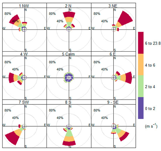 The SAM Hi 30 AUTO WIND is a fully automatic, remote-controlled sampler intended for gravimetric and chemical analyses of aerosol particles. The device samples particulate matter with a <10 μm diameter (PM10) using the DIGITEL DPM10/30/00 PM10 pre-separator for 30 m3/h according to EN 12341 [34]. The sampler was designed to work depending on wind conditions. It has a magazine of 15 filters (glass microfiber, Whatman GF/A, Ø 150 mm) stretched in filter holders that are automatically changed to the sampling position according to actually evaluated wind conditions. Thus the sampler was able to collect PM10 particles from eight basic wind directions (N, NE, E, SE, S, SW, W, NW) and CALM (wind speed < 0.2 m·s−1). The sampler can be seen in Figure 3. Both wind speed and wind direction were measured via the WindSonic™ SDI-12 anemometer (Gill Instruments Ltd., Lymington, UK). The wind direction and wind speed for selecting a particular sampling filter from the magazine were determined according to one-hour moving averages calculated from 10-min data in accordance with US EPA guidance [35]. Thus, the actual wind may be different. The wind roses representing the measured wind direction in comparison with the sampled sector can be seen in Figure 4. Moreover, a special filter was designed for the episodes with extreme air pollution, defined as three successive average hourly PM10 concentrations exceeding 100 µg·m−3, using 10-min data from continuous ground monitoring.