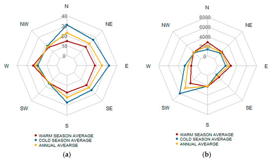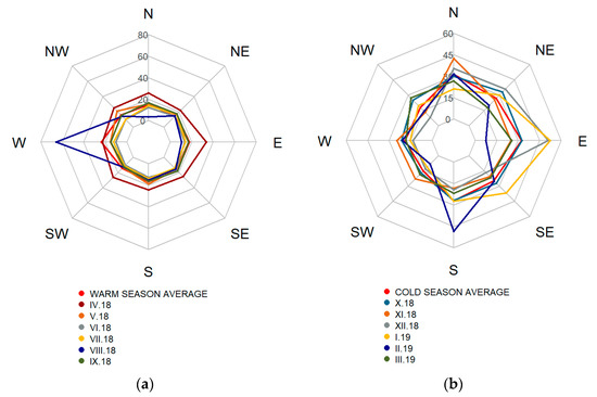 The lowest PM10 values were observed from the SW and NW directions regardless of the season. The concentrations were below average in the warm part of the year, with the exception of the west direction due to the peak concentration in August 2018 (Figure 6). The highest concentrations were sampled from the east and north during the cold season, though prevailing wind direction in the season was SW Figure 5b. This wind direction in the cold season was the prevailing wind direction for the whole period of observation, as Figure 5b shows (expressed as a sampled air volume). Calm was recorded for 12% of the sampling time.