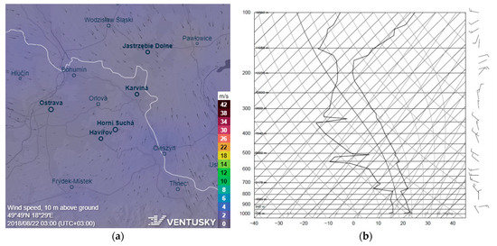 The modelled wind fields (a) and the Skew-T diagram at the Prostějov sounding station (b) for August 2018 peak concentrations [48,49].