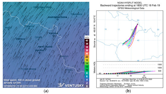 The modelled wind fields (a) and backward trajectories (b) for February 2019 peak concentrations [48,50,51].