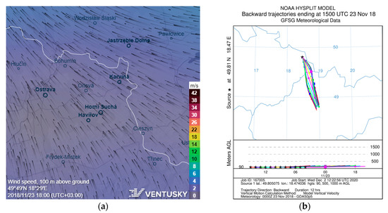 The modelled wind fields (a) and backward trajectories (b) for the smog situations in November 2018 [48,50,51].